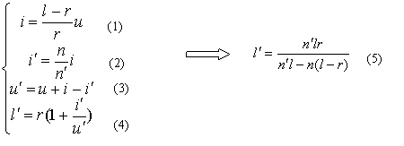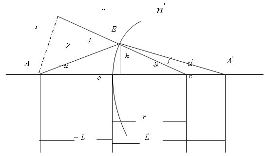 已知:折射球面曲率半徑r,介質(zhì)折射率為n和n',及物方坐標(biāo)L和U