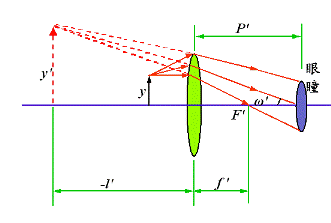 這個公式適于小放大倍率(長焦距)的放大鏡,即看書用的放大鏡。若眼睛緊靠著放大鏡,即P'≈0,則
