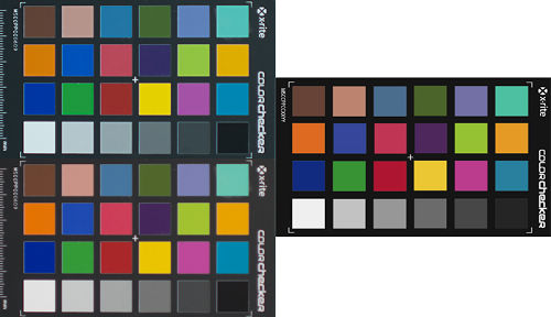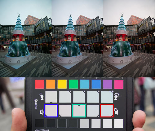 DNG配置文件的實際效果如何?色卡本身的照片非常具有說服力,下圖1、2、3是同一張RAW輸出的不同結果,左上方是Lightroom里的默認輸出,左下方則是套用根據這張照片制作的DNG配置文件后的結果,右側是作為對比的標準色卡電子文件。很明顯,矯正后的各個色塊更貼近實際應有的色彩表現。