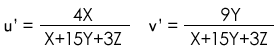 | 均勻色度等級(Uniform Chromaticity Scale)的出現彌補了1931系統的缺點。 它嘗試提供一種在大致相同的亮度下,人的感知更統一、更均勻的色空間。 1976 CIE UCS色度圖使用u’和v’, 這兩個符號的使用,是為了與相類似但存在時間短暫的1960 CIE-USC系統的u、v符號相區別。 u’和v’的值也是從XYZ三刺激值計算得到的,計算公式如下: |