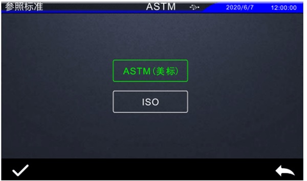 在主菜單中點擊“參照標準”,進入參照標準設置界面,可選擇ASTM(美標)或者ISO。選中“ASTM(美標)”,點擊確認“√”,儀器進入ASTM(美標)測量標準;選中“ISO”,點擊確認“、√”,儀器切換到ISO測量標準。如圖所示。