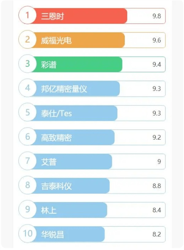 根據品牌信譽、銷量、注指數等數十項數據,通過云計算分析得出2022年色差儀的十大品牌排行榜如下:三恩馳、三恩時、彩譜、同奧、恒思通、滬鏡、華銳昌、常泰勒、SFMIT和上物等。