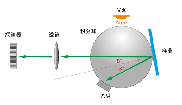 積分球是一個直徑大于等于十幾厘米的中空金屬球,它的內(nèi)表面涂布有高反射漫射物質(zhì),如硫酸鋇或聚四氟乙烯,理論上要球其不吸收光線。進入這個球體的光線經(jīng)過多次反射后,照射在樣品上,這時可判斷來自積分球內(nèi)不同角度的光通量均相同,達到完全漫反射狀態(tài),可以同時將鏡面光包含在測量內(nèi)(SCI模式)或?qū)㈢R面光排除在測量之外(SCE模式)。