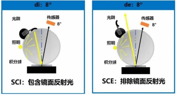 SCI和SCE一般只會出現(xiàn)在d/8結(jié)構(gòu)的分光測色儀器的設(shè)置選項中,SCI指包含鏡面光方式,一般用于那些研究顏色本身屬性而不關(guān)心顏色所附著的樣品表面光澤度的廠家,如油漆涂料廠等。SCE指不包含鏡面光方式,一般適用于那些直接被人觀測到的,要求測量結(jié)果和目視非常接近的樣品,如家電外殼等。