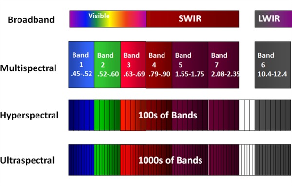 光譜范圍為可見光,近紅外,短波紅外,中波紅外,熱紅外,超光譜成像系統(tǒng)可提供成千上萬個非連續(xù)波段的圖像,主要應用于復雜的圖像分析。