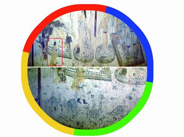 圖為《樂舞圖》,是韓休墓中的一幅壁畫,左側(cè)地毯前的男子可以隱約發(fā)現(xiàn)改動的痕跡(上圖),經(jīng)過對高光譜圖像的進(jìn)一步分析發(fā)現(xiàn),左側(cè)地毯前的男子處原先畫了一個小孩(下圖),后來被修改成了大人。