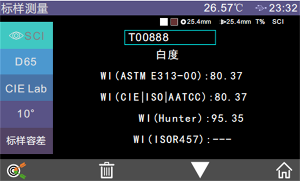 在測量完成后,可以在測量屏幕查看測量數據。如圖所示。顯示了四種不同材料標準下白度測量結果。
