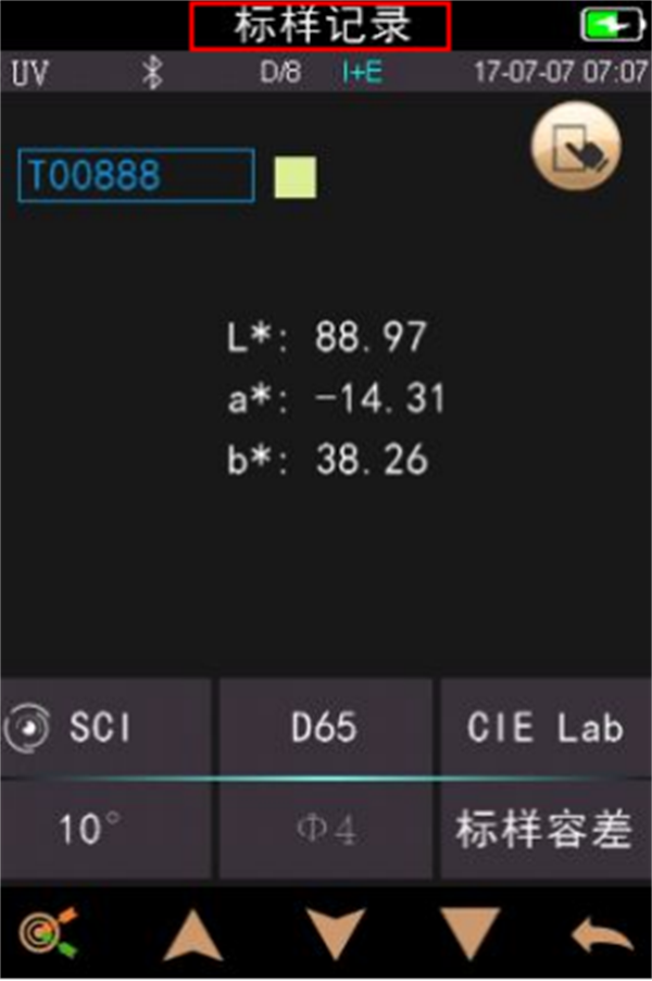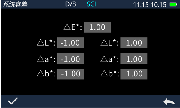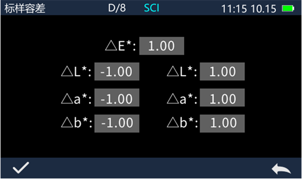 界面中△E*為設置標樣總容差(CIE1976);左側△L*為設置標樣容差下限,右側△*為設置標樣容差上限,右側容差上限一定要大于容差下限;Δa*、Δb*設置方法同于△L*。點擊對應的容差數值,進入相應的數值設置界面,設置完畢點擊“V”確認保存,即以此容差為標準;若點擊下側“←”取消并退出容差設置界面。