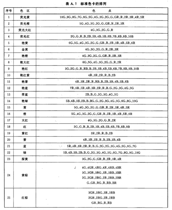 本標準色卡乙種本與甲種本比較以及復制時色光的許可誤差為:按GB 250-1995進行評定時不低于4~5級。