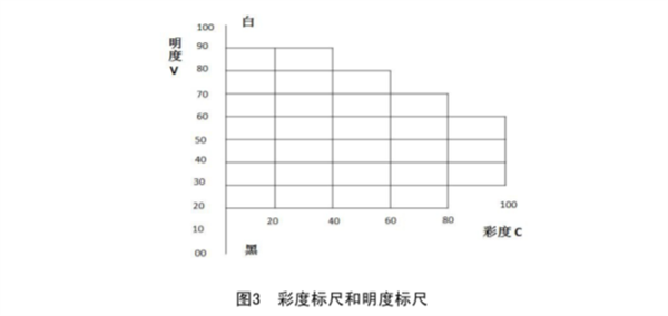色立體的中心軸從絕對(duì)黑色的00到絕對(duì)白色的100分為11級(jí),相鄰明度之間在視覺上是等距的,見圖3中的明度標(biāo)尺的編號(hào)。