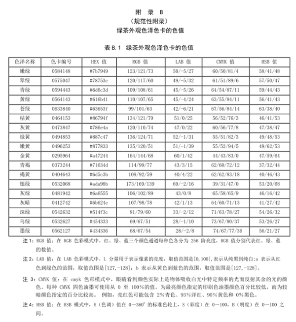 綠茶外觀色澤色卡和色澤編號(hào)見附錄A,具體色值見附錄B。
