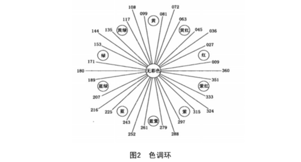 色調(diào)環(huán)上以紅、黃、綠、藍(lán)、紫5色作為主色,并以紅色為色調(diào)環(huán)逆時(shí)針?lè)较虻钠瘘c(diǎn),在相鄰兩主色的中間的顏色為中間色,即黃紅、黃綠、藍(lán)綠、藍(lán)紫、紫紅。主色與中間色組成10種基本色,各占圓的一個(gè)10等分點(diǎn)。為了對(duì)色調(diào)作更細(xì)的劃分,又將10種基本色的鄰色之間劃分為4等分。因此,色調(diào)環(huán)上共有40種色調(diào),相鄰色調(diào)之間在視覺上是等距的,見圖2。