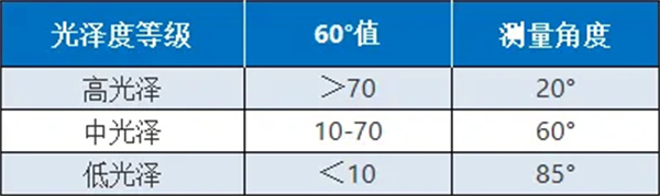 為了區分光澤度的大小,定義了三個不同的角度(光路)即三個不同的范圍,也就是我們通常所說的高光澤物體、中光澤物體和低光澤物體,具體如下: