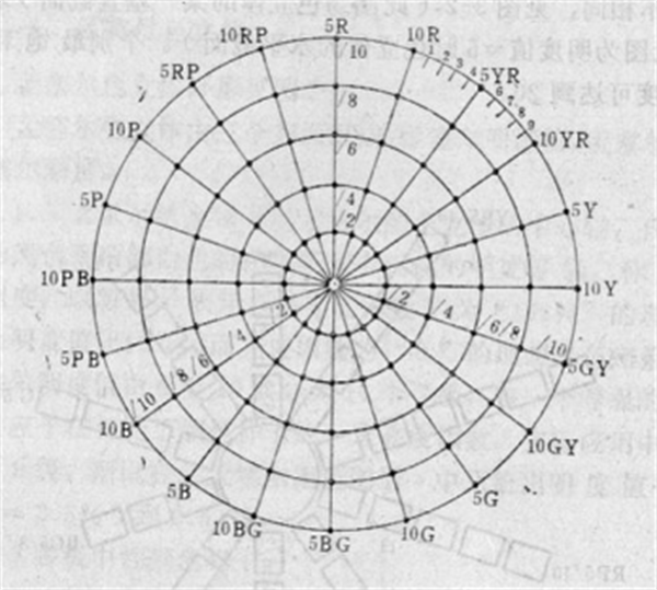 顏色的色調H用圍繞孟塞爾立體中央軸的角位置來代表。孟塞爾立體水平剖面上以中心軸為中心,將圓周分為相等的10個部分(如圖5-33),五個主要色調紅(R)、黃(Y)、綠(G)、藍(B)、紫(P)和五個中間色調黃紅(YR)、綠黃(GY)、藍綠(BG)、紫藍(PB)、紅紫(RP)。每一種色調再細分成10等級,從1到10,并規定每種主要色調和中間色調的標號為5。孟塞爾色調有100種。在《孟