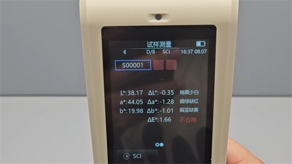4. 讀取結果:測量完成后,CR8分光色差儀將在屏幕上顯示粉餅樣品的色度坐標(如L*、a*、b*值)和色差值(如ΔE)。這些數值反映了粉餅顏色的亮度、紅綠偏差和黃藍偏差以及與標準色的差異程度。