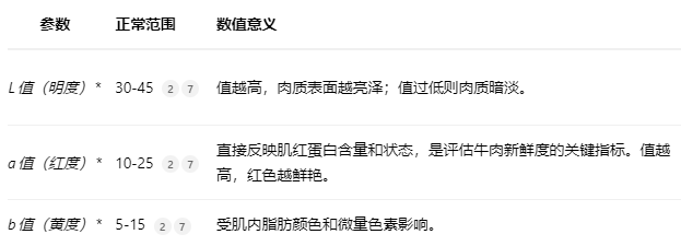根據國家相關標準與多項研究,正常牛肉的顏色參數在Lab色彩空間中具有相對穩定的范圍。Lab顏色空間由三個維度組成:L值代表明度(從0黑色到100白色),a值代表紅綠度(正值偏紅,負值偏綠),b值代表黃藍度*(正值偏黃,負值偏藍)。正常牛肉的具體Lab值范圍如下表所示: