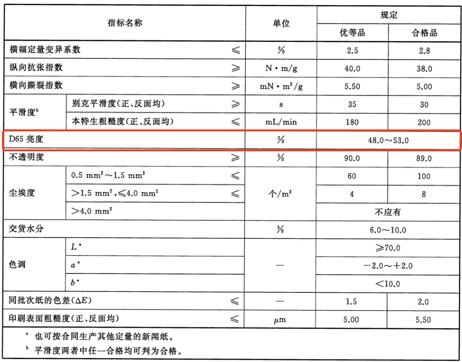 這一標準明確規定了新聞紙的D65亮度(即白度)范圍。D65亮度是指在D65光源模擬日光條件下,紙張對457nm藍光的漫反射因數測量值。在日常生活中,我們簡單稱之為“白度”。