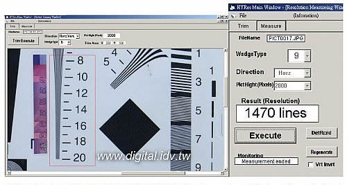 HYRes 3.1運作原理依據 MTF,而非SFR;程式介面分成切割區(Trim)與測量區(Measure)兩大部分,使用時須切割下解像力尺(如紅框),電腦會自動檢查尺上的臨界點,再經由換算得出解像力線數。程式和運作都非常簡單,符合日式風范,不過,這種作法也有極限存在,本站推出 2005年年鑒第62頁 - Canon 1Ds MKII 因其解像力本身已經超過 ISO12233 的臨界點所以無法導出結果。