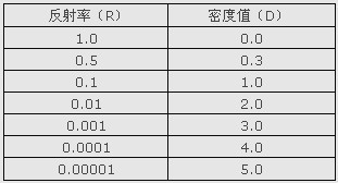 為了更好地理解密度的含義,我們?cè)O(shè)想有一個(gè)能夠100%反射入射光的表面,我們稱這樣的表面為完全漫反射體。這個(gè)表面的反射率R=1.0,因此密度值就是0。如果我們進(jìn)一步考察其他的一些表面,它們分別可以反射入射光的50%,1%,0.1% …… 因此,我們就可以得到下面的一系列數(shù)值: