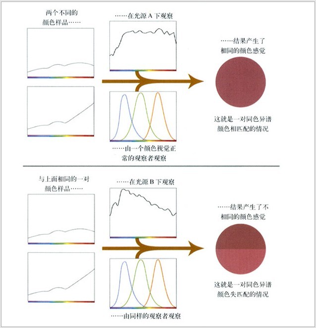 簡而言之,同色異譜就是兩個不同的顏色樣品會產生相同顏色感覺的一種現象。我們所謂“不同的顏色樣品”是指兩個物體具有不同的光譜特性。請回憶一下我們用光源-物體觀察者來對顏色下的定義,如果兩個不同的物體產生了相同的“顏色”(同樣的顏色感覺),這種顏色的匹配條件可能取決于(1):照明兩個物體的光源,或(2):觀察兩個樣品的觀察者。換了不同的光源,或由不同的觀察者來觀察,這兩個樣品也許就不再匹配了,我們稱其為條件匹配。