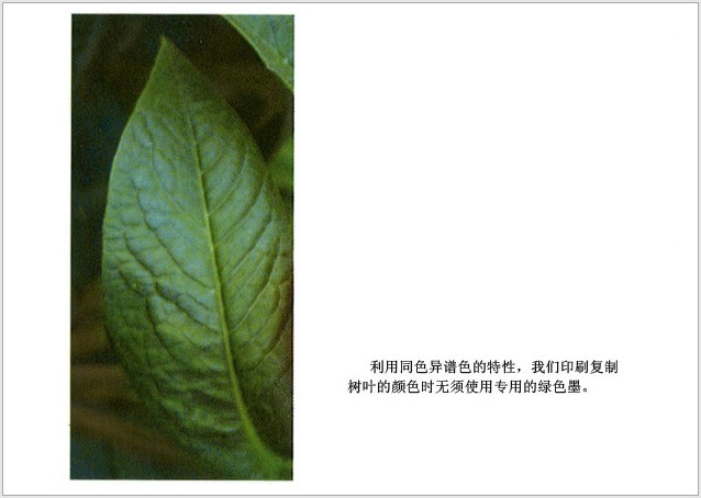 對于色彩管理來講更重要的是,只有利用同色異譜色才使顏色復制成為可能。同色異譜色使我們在顯示器上顯示黃色或膚色時無須使用專門的黃色或皮膚色的熒光粉。同色異譜色使我們在復制葉綠素(植物體內一種色素)的綠色特征時,不用使用葉綠色素的油墨,或使用一種我們稱為綠色的油墨(見圖1-16)!
