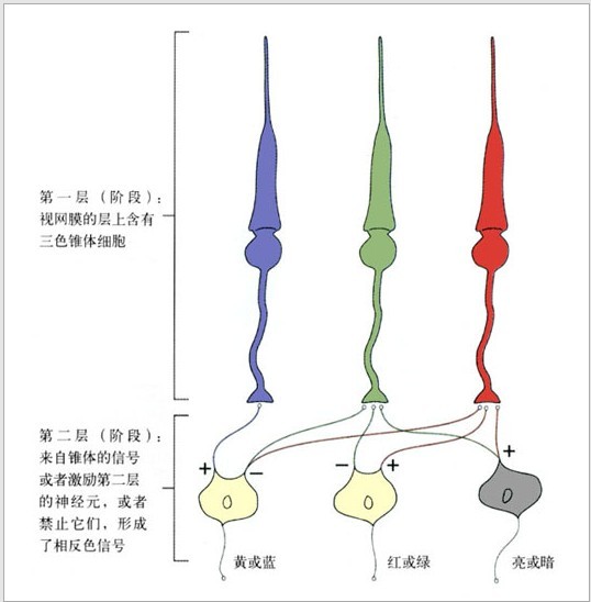 (圖1-14:神網膜中的三色學說與相反色學說)