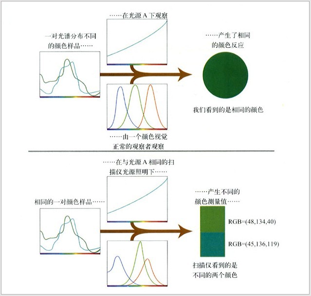 如果一臺掃描儀的紅、綠、藍探測器的響應與我們的錐體細胞感受器不同,掃描儀看上去是相互匹配的同色異譜色對,你我的眼睛看上去就可能是不同的顏色。反過來也一樣,一對我們看起來一樣的顏色,掃描儀會認為是不同的顏色(如圖1-7所示)。有時我們將這種現象稱為掃描儀同色異譜特性,這就是難以將掃描儀作為一種測量設備去制作特性文件的原因。同樣地,假如一臺膠卷照相機或一臺數字相機具有與我們視覺系統不同的同色異譜匹配特性,我們就將其稱為相機的同色異譜特性。由于色彩管理對此實際是無能為力的,因此你必須將它看做是一個問題。