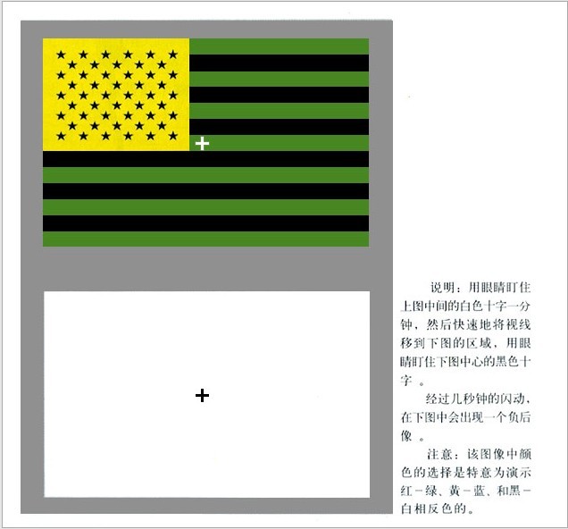 其他三色學說無法解釋的顏色視覺現象。我們無法想像一種帶紅的綠或帶綠的紅。這一事實說明有些現象已經超出了三種獨立感受器(三色學說)所能解釋的范疇。對于藍和黃也同樣存在這種問題,因為我們也無法想像帶有黃色的藍。圖1-12和圖1-13所示的的同時對比與負后像現象是另外兩個顏色視覺現象的例子,它們說明,若缺少了某個顏色,則會產生出與該顏色互補的顏色感覺。后,顏色視覺異常的人(色盲)缺失的顏色感覺通常是成對的:一個人的紅色響應異常,則通常他也缺少綠色辨別能力;一個人若沒有藍色響應,則也一定沒有黃色響應。