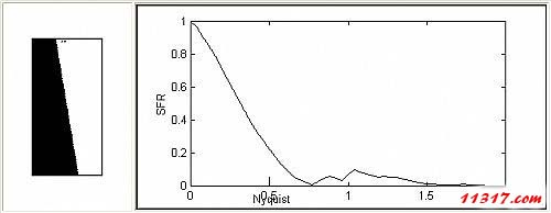 新名詞 SFR!Spatial frequency response (SFR) 主要是用于測(cè)量隨著空間頻率的線條增加對(duì)單一影像的所造成影響。簡(jiǎn)言之SFR就是MFT的精簡(jiǎn)版。因?yàn)闇y(cè)量MFT需取得昂貴的正弦樣版,并且需換算大量的數(shù)據(jù)。因此,PIMA開發(fā)了這款 較低成本的SFR作為替代品。基本上SFR只需一個(gè)雙色調(diào)的黑白斜線(如下左圖所示)即可換算出約略相等于MFT的值的解像力評(píng)鑒圖。