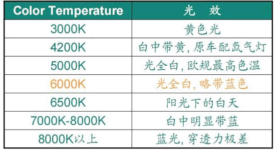 汽車氙氣燈色溫對照圖,色溫對照表,色溫定義