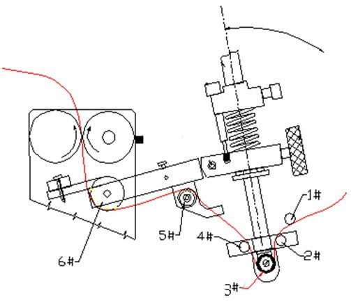 (1)啟動馬達,直接自供給卷輪拉出紙帶,先將紙帶往上穿越此兩個滾輪間隙,再停止馬達,依照#1至#6號,之次序安裝紙帶