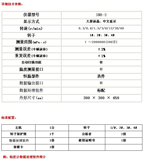 SNB系列的數字式粘度計采用16位微電腦處理器為核心的步進電機高細分驅動技術、程序控制、轉速平穩、操作簡便;液晶背光顯示屏直接顯示粘度、轉速、百分比扭矩、轉子編號以及被測液體的溫度等信息,有出錯報警等功能。采用先進的準確性校準技術,每一檔的準確性、線性全部經過外接計算機用不同粘度的標準硅油進行計量校正。確保了儀器的高精度、高準確性和高重復性。主要特點:① 被測試樣的粘度值直接顯示在液晶屏上,無需人工計算;② 采用16位微電腦處理器為核心的步進電機高細分驅動、液晶背光顯示;③ 采用程控電機控制,市電頻率變化不影響測量精度;④ 整機一機化設計,操作方便;⑤ 采用大屏中文背光液晶顯示,具有粘度測試自動掃描功能推薦轉子及轉速的更佳組合,測試即方便又準確;⑥ 儀器可提供測試低粘度選件“0號轉子” ,用來精確測試范圍1~100mpa.s的粘度值;⑦ 可選擇溫度探頭,實時測量被測試樣的溫度,測溫精度0.1℃;⑧ 有RS232接口(或選配USB2.0接口),可輸出數據,連接外部設備;⑨ 標配數據處理軟件,能實時記錄試樣粘度隨時間、轉速或轉子(剪切速率)、溫度的不同而發生的變化,這對了解非牛頓液體的粘度大小和流變特性提供了很好的分析方法。 廣泛應用于油脂、油漆、涂料、漿料、紡織、食品、藥物、膠粘劑、化妝品等流體、半流體的生產行業和科研單位。儀器以測量準確、快速、直觀、簡便的優點,獲得各行業的客戶選用。