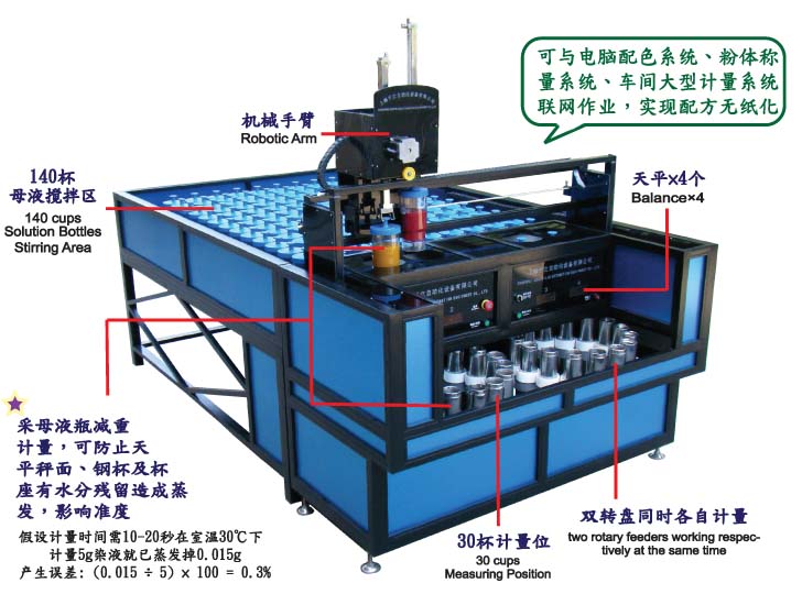 人性化母液管理功能自動精準記錄染料剩余量,可知優先泡藥順序,并有染液過期提醒功能,便于管理。模組化設計本機的機械手,轉盤,天平,敲打盒皆為可關閉的獨立模組,可在關閉模組的情況下,繼續完成計量作業