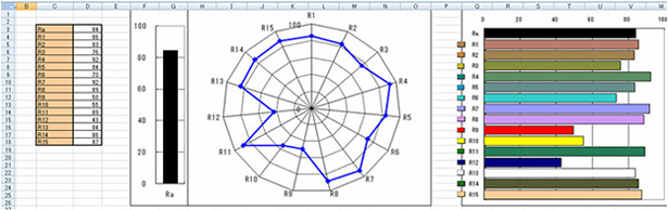 顯色指數(shù)采用直觀顯示,便于理解。被測(cè)光源和標(biāo)準(zhǔn)光源的色差一目了然,條形圖顯示一般顯色指數(shù)Ra(特殊顯色指數(shù)R1至R8的平均值)和15種特殊顯色指數(shù)(R1至R15)。
