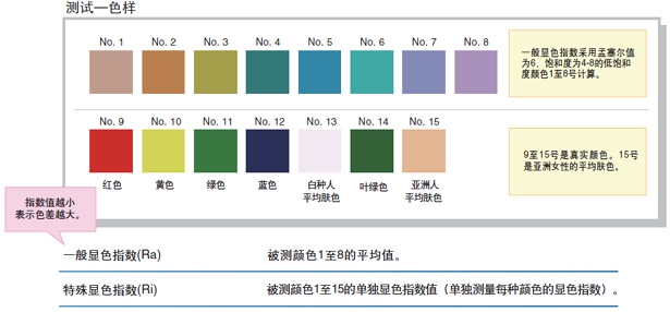 光源顯示的色調(diào)越接近自然原色,其顯色性就越好(或越高)。顯色指數(shù)是對(duì)燈或其他光源顯色性的量化結(jié)果,旨在提供客觀標(biāo)準(zhǔn)。顯色指數(shù)表示被測(cè)光源和標(biāo)準(zhǔn)光源※ 的接近程度。大值為100。顯色差異越大,值越小,說(shuō)明被測(cè)光源顯示的顏色和自然原色的差距越大。