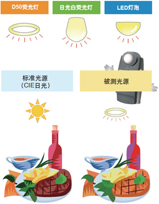 除了熒光燈,近LED(發(fā)光二極管)也已被用作照明燈。物體在這些光源下顯示的色貌與其在自然光下原色貌進(jìn)行比較,兩者的接近程度就是光源的"顯色性"。