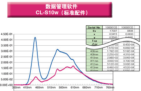 CL-500A不但可以測(cè)量顯色指數(shù),還可測(cè)量照度(lx)、色坐標(biāo)(1931xy, 1976u'v')、相關(guān)色溫T?uv、三刺激值XYZ、特征波長(zhǎng)λ、色純度Pe、色差值。通過(guò)隨機(jī)附送的軟件CL-S10w,可連接電腦顯示光源的顯色指數(shù)評(píng)估圖、色溫色坐標(biāo)圖、光譜數(shù)據(jù)等。針對(duì)同一批次LED也會(huì)出現(xiàn)較大色差的問(wèn)題,軟件提供按顏色對(duì)LED分級(jí)的功能。
