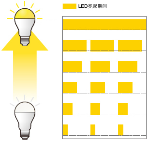 PWM 是" 脈沖寬度調(diào)制" 的縮寫," 脈沖寬度調(diào)制" 是一種通過控制脈沖信號ON 期間和OFF 期間的比率來控制信號強度的方法。脈沖信號是一種在ON 和OFF 之間反復(fù)交替的信號,ON期間在一個周期中的百分比被稱為" 占空比"。PWM 控制照明是一種通過控制來自脈沖發(fā)射源光占空比(發(fā)光時間)來控制燈亮度的方法。 發(fā)光時間越長,光就會變得越亮;反過來,發(fā)光時間越短,光就會變得越暗。