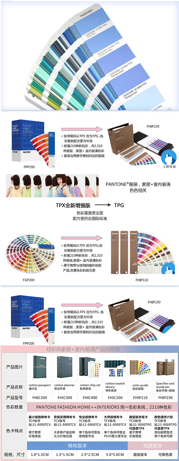 原TPX色彩指南升級為新的名稱TPG色彩指南(但仍保持與原有TPX后綴版相同的色彩完整性),在原來2,100種顏色基礎上,2016年3月新增210種新色彩,全套2,310種顏色,迄今顏色更多全的產品,本套裝包含兩本書形可撕色票,單頁便于取出,顏色也可供撕出達六次之多,另包含一本便攜式色彩南,扇形版本,方便于查色及外帶,應用于:服裝,紡織,家居,室內外裝潢,使用行業多,是一款值得推薦的產品.