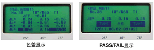 | 顯示內容 | 色度值:L*a*b*、L*C*h 色差值:Δ(L*a*b*)、Δ(L*C*h*)、ΔE*ab CMC (l:c)、ΔE00 (CIE 2000) 其他:FF值、折線圖 |