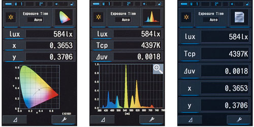 | 色彩顯示模式 | 相關色溫Tcp、與黑體Δuv的差異、XYZ、xy、u'v'、特征波長λd、色純度Pe、光譜輻射照度、EV、CRI(Ra、Ri)、峰值波長λp、曝光值 |